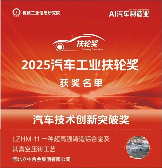 2025年12月5日,以“大雅扶轮,众行致远”为主题的2025“汽车工业扶轮奖”颁奖典礼在上海隆重举行。立中集团研发的LZHM-11,一种超高强铸造铝合金及其真空压铸工艺,荣获2025汽车工业扶轮奖·汽车技术创新突破奖,再次彰显公司的综合实力和创新能力。